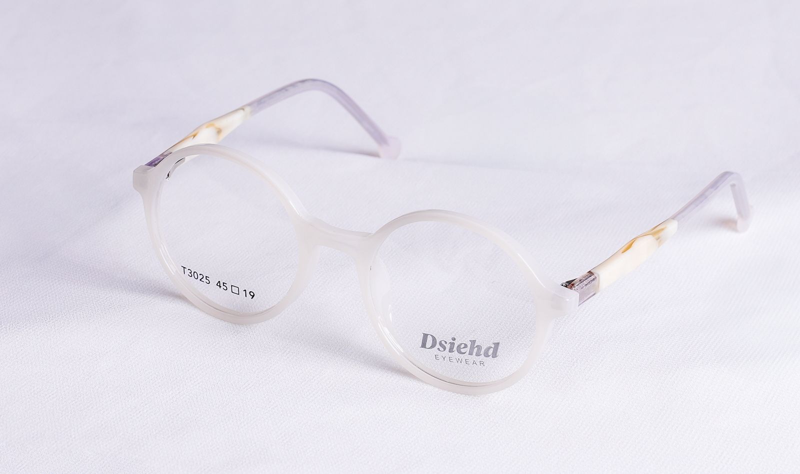 Monture blanche translucide, branches dégradées violettes — une élégance légère aux reflets nordiques.